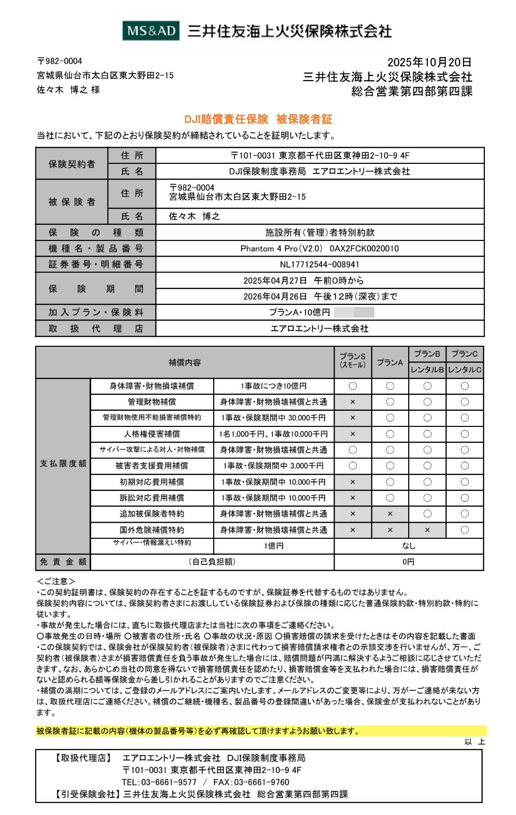(国家資格)一等無人航空機操縦士 第23100078851号 佐々木 博之(基本+昼間限定解除+目視内限定解除)