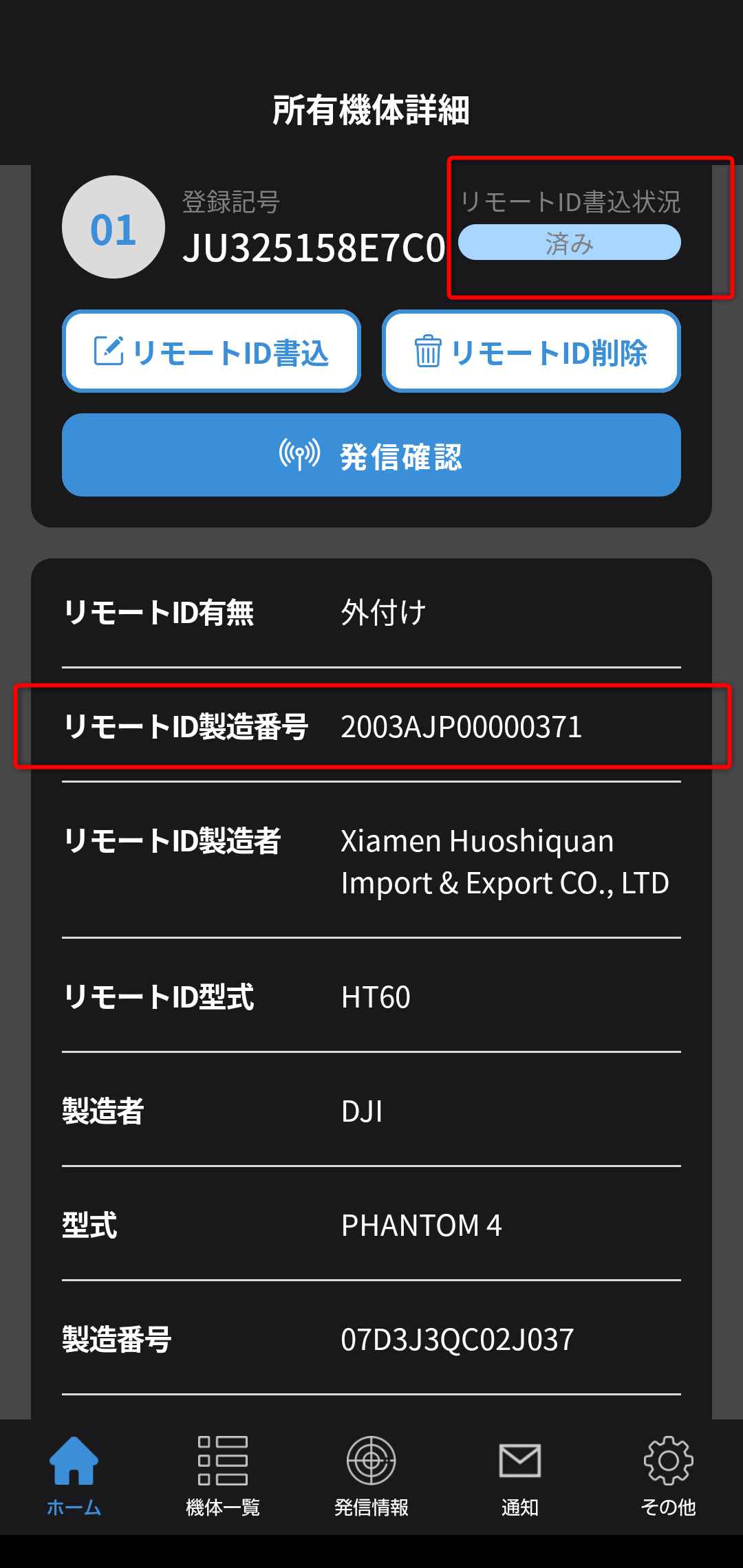 機体に関する情報(製造者名、型式、登録記号等)